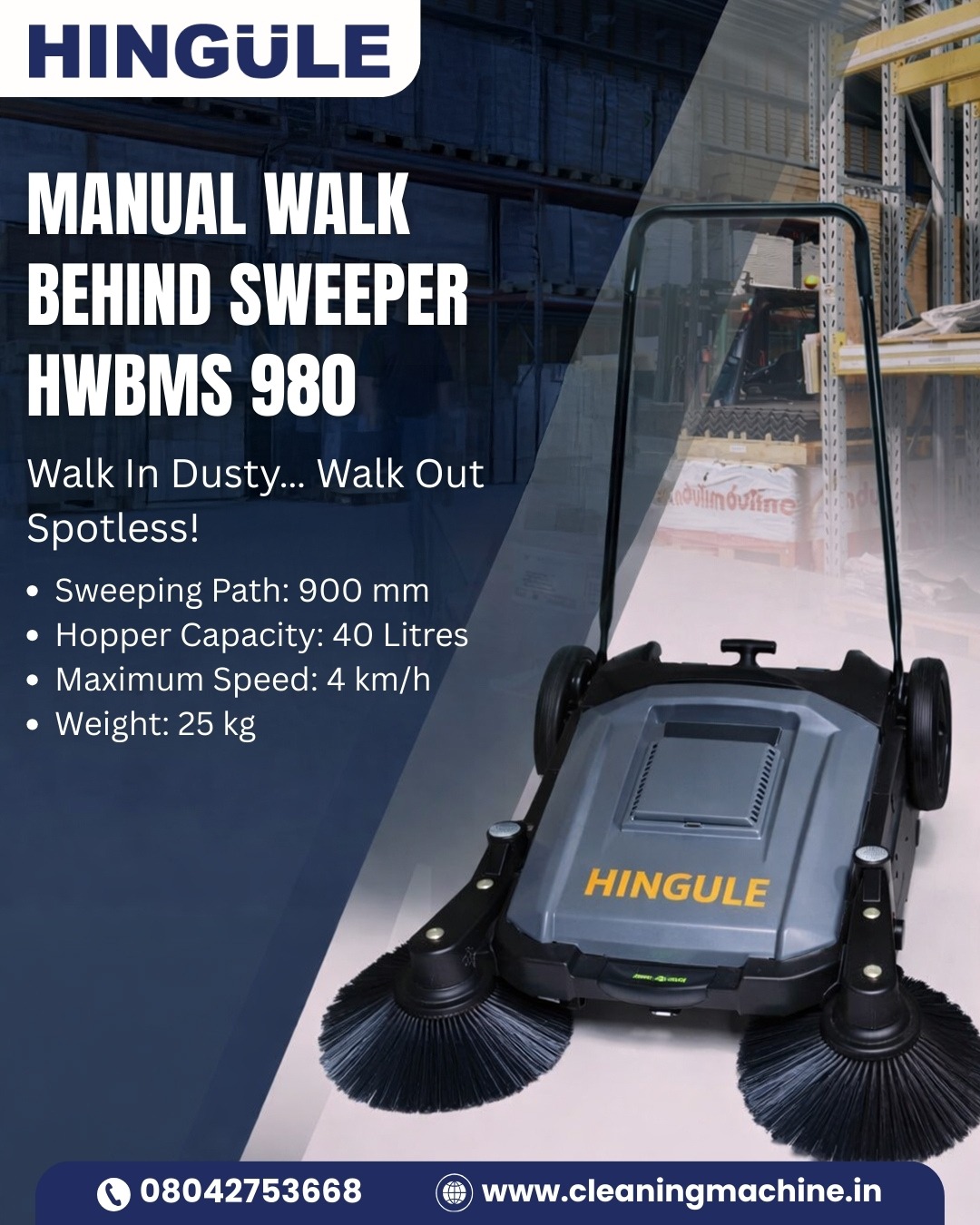 Looking for a reliable and cost-effective solution for industrial and commercial cleaning? Hingule Engineering presents the HWBMS 980 Manual Walk Behind Sweeper, designed for efficient cleaning of warehouses, factories, workshops, parking areas, campuses, and large public spaces across Ahmedabad and India. With a wide 900 mm sweeping width, it covers large areas quickly, reducing manual effort and saving time. The 40-liter waste hopper ensures uninterrupted cleaning, while the polypropylene main brush and PP wire side brush effectively collect dust, sand, paper scraps, and industrial debris. The integrated non-woven panel filter controls dust dispersion, keeping your environment clean and healthy.