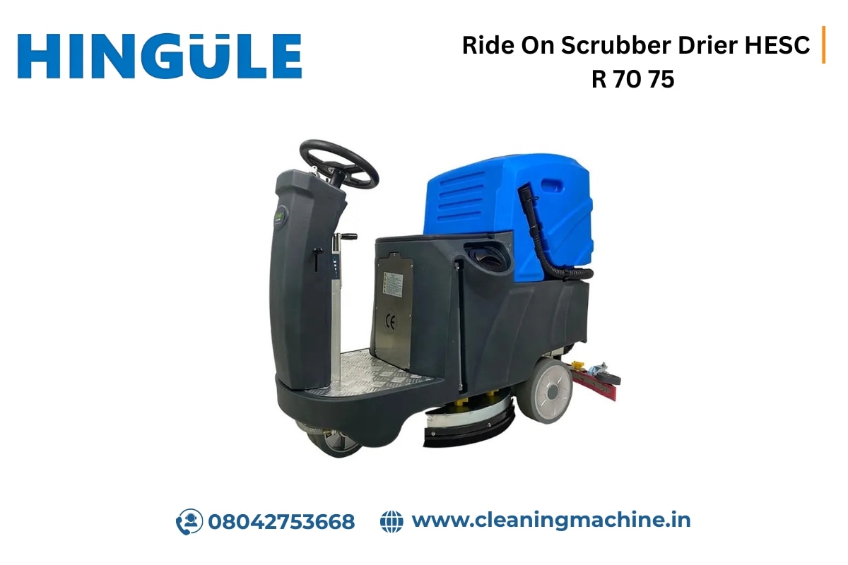 Ride On Drier HESC R 70 75 Scrubber Dryer Manufacturers in India. The Electric-Powered Ride-On Scrubber Drier by Hingule Engineering is built for powerful and safe floor cleaning. With high-traction battery options and up to 5 hours of runtime, it’s perfect for large spaces like malls, airports, and industrial sites. This Electric-Powered Ride-On Scrubber Drier includes an intuitive soft-touch panel, tool-free brush replacement, and a break-away squeegee for maximum ease. Operators love the Electric-Powered Ride-On Scrubber Drier for its convenient storage and built-in fault diagnosis system that makes maintenance easy. With anti-skid wheels, a reverse alarm, and front headlamp, the Electric-Powered Ride-On Scrubber Drier ensures smooth and safe operation every time. Technical Specifications: Cordless operation with battery power (24V/320Ah) Scrubbing width: 950 mm | Suction width: 1200 mm Cleaning capacity: 6175 m²/hr Runtime: Up to 5 hours Two brushes (485 mm each), 195 rpm speed Brush pressure: up to 52 Kg Fresh & dirty water tanks: 120 Ltr each Vacuum suction: 1730 mm H₂O | Drive speed: 7 km/h Reverse alarm, headlamp & anti-skid wheels for safety Compact turning radius: 1.8 m | Total weight: 665 Kg Call us today for more information or to place an order!